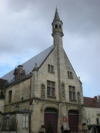 Le bâtiment, de forme trapézoïdale allongée, orienté est-ouest, est couvert d'un toit en dos d'âne aigu et très élevé, recouvert d'ardoises. La façade principale en pignon, du côté de la place, est divisée en deux parties, de haut en bas par un campanile hexagonal qui dépasse de deux mètres environ l'angle supérieur du toit et se termine par un clocheton très pointu contenant une cloche du XIVe siècle (classée monument historique)[4]. Deux larges arcades, en anse de panier, de chaque côté du campanile, forment les portes du rez-de-chaussée. Deux fenêtres s'ouvrent au-dessus, divisées par des meneaux. On peut voir à la même hauteur, trois niches de style néo-ogival, à moulures cylindriques : une sur le beffroi, dans laquelle se trouve Robert de Clermont, comte de Clermont, sixième fils de saint Louis; dans les deux autres, à chaque angle de la façade, figurent les statues de Louis IX et Charles IV « le Bel ». Deux autres fenêtres encadrées par des moulures creuses et divisées également par des meneaux sont situées au-dessus des premières[a 3].