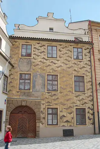 Le bâtiment de l'ancien hôtel de ville a été construit à la fin des XVIe et XVIIe siècles, alors que Hradčany était par décret de l'empereur Rodolphe II de 1598, une ville indépendante qui avait besoin de construire son propre hôtel de ville. La façade de l'édifice porte l'emblème de la ville de Hradčany, l'emblème impérial et le symbole de la justice.