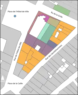 - l'enceinte côté place de l’Hôtel de Ville et la tour[25] ;