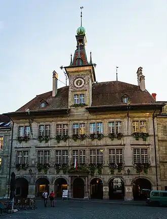 L'hôtel de ville donne sur la place de la Palud. Sa façade arrière donne sur la place de la Louve ; les deux places sont reliées par un passage passant sous le bâtiment. Le bâtiment est surmonté d'un beffroi dont les cloches étaient utilisées en cas de danger. Il surplombe le toit qui, par sa forme, rappelle celle des fermes traditionnelles de la région[6]. L'ensemble du bâtiment est inscrit comme bien culturel suisse d'importance nationale[11].