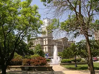 Les pierres calcaires provenaient de carrières de la localité de White River près de Salem dans l'Indiana. La construction débuta en 1870 et le coût total s'éleva à 464 778 dollars. L'extérieur fut rénové plusieurs fois, mais sans grands changements. Par contre, l'intérieur a été plusieurs fois complètement retravaillé.