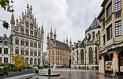 Bien que l'hôtel de ville de Louvain soit généralement assimilé à son aile de style gothique tardif édifiée le long de la Grand-Place (Grote Markt) face à l'église Saint-Pierre, il constitue cependant un ensemble monumental plus vaste qui occupe tout le bloc délimité par la Grand-Place, la rue de Namur (Naamsestraat), la rue de la Monnaie (Muntstraat) et la rue de la Librairie (Boekhandelstraat)[1].