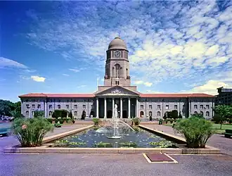 Avec sa tour de 47 mètres de hauteur et son carillon, l'édifice en granit et au toit en tuiles italiennes, comme le sont beaucoup de bâtiments publics de Pretoria des années 1920 et 30, est entouré de jardins paysagers et de trottoirs. Le bâtiment est séparé du Transvaal Museum, de l'autre côté de Kruger street, par Pretorius square, une esplanade verdoyante où se succèdent les statues de personnalités historiques, un bassin de nénuphars et des fontaines.