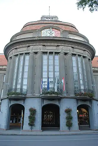Le bâtiment est constitué de quatre ailes disposées en rectangle et formant une cour intérieure. Sur le plan stylistique, l'ensemble est caractéristique d'un mélange entre le fonctionnalisme et le style de la Sécession hongroise, particulièrement visible dans la grande avancée ovale de la façade principale[1]. Le style Sécession est notamment sensible dans la décoration qui, sur le plan horizontal, comporte des corniches, des rubans et des frises avec des ornements floraux stylisés ou des motifs géométriques ; sur le plan vertical l'avancée centrale est rythmée par des pilastres dont la verticalité est soulignée par des cannelures ainsi que par de grandes baies vitrées[1].