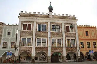 Les premières nouvelles concernant la mairie remontent à 1443. Le bâtiment massif a été créé en reliant deux maisons gothiques. En 1574, le bâtiment a été reconstruit dans le style Renaissance, créant l'extraordinaire façade. La conception est attribuée au constructeur italien Baldassare Maggi, qui a également dirigé la rénovation du château de Telč. La façade se termine par un créneau et une tour ronde à bulbe.