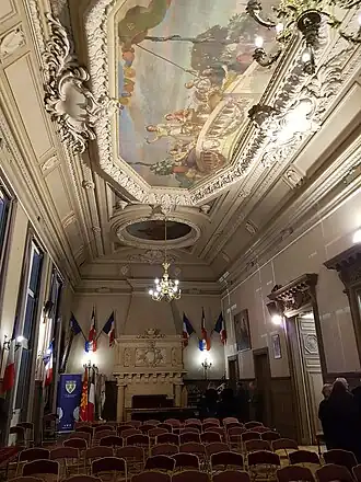 Dans la salle des mariages, le plafond est orné de peintures représentant les productions vinicoles et cidricoles locales par Charles Denet[15], [16].