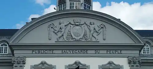 L'avant-corps, flanqué d'escaliers, est délimité latéralement par deux pilastres d'ordre colossal dont les chapiteaux corinthiens supportent un entablement portant la devise « Publicité, sauvegarde du peuple ». Cet entablement porte un fronton courbe dont le tympan est orné des armoiries de la ville, entourées de guirlandes de fleurs et surmontée d'une couronne et d'une guirlande de laurier soutenue par deux bambins.