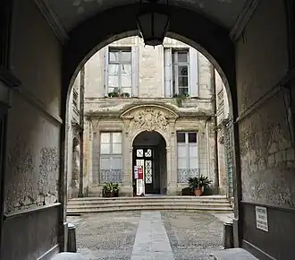 Le portail de style Louis XIV est le plus haut de Montpellier, sa composition encore maniériste se caractérise par son cadre à refends, ses vantaux compartimentés et son imposte très ouvragée[1]. Ce portail donne accès à la cour d'honneur au fond de laquelle une porte à fronton cintré, avec motif richement sculpté, conduit par une galerie à la seconde cour de l'immeuble. À gauche dans la cour d'honneur se trouve le grand escalier dont les balustrades rampantes se composent d'éléments compris entre les piliers extérieurs et intérieurs qui supportent le limon au moyen d'arcs rampants[2].