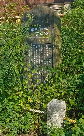 « Ici se tenait la résidence du clan Hōjō. À partir du [deuxième régent] Hōjō Yoshitoki, les shikken (régents) y résident habituellement. Le [dernier régent] Hōjō Takatoki faisait la fête jour et nuit et parfois, avec les autres vassaux, donnait à un exécutant de dengaku une montagne de hitatare (un type de vêtement) et de hakama comme récompense. Le manoir a été détruit par un incendie lors de la prise de Kamakura par Nitta Yoshisada en 1333. Le Hōkai-ji d'aujourd'hui est construit ici en 1335 par Ashikaga Takauji. Ce temple a été construit ici en tant que temple funéraire des Hōjō pour apaiser le ressentiment de Takatoki et de son clan qui étaient déjà vénérés au Tōshō-ji. »