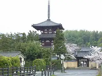 - Il a été construit en 670 par trois moines, Kudara Kaihōshi, Enmyōshi et Shimohishinmotsu, dans le cadre de la reconstruction de Hōryū-ji qui avait brûlé cette même année. La date originale de construction n'est pas claire mais les dernières recherches suggèrent que c'était au VIIe siècle. Le temple était un trésor national désigné jusqu'à ce que la dernière structure restante d'origine du complexe, la pagode de trois étages, soit frappée par la foudre en 1944 et détruite par l'incendie. L'actuelle pagode est une reconstitution de 1975, et contient le reliquaire d'origine sauvé de l'incendie de 1944.