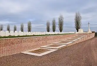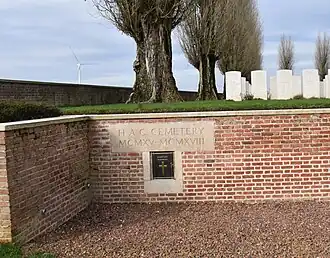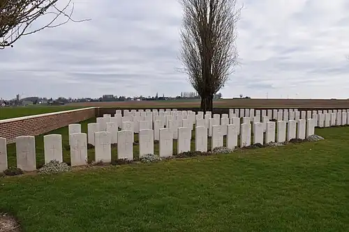 Il y a maintenant près de 2 000 victimes de la guerre 1914-18 commémorées sur ce site. Parmi ceux-ci, plus de la moitié sont non identifiés et des monuments commémoratifs spéciaux sont érigés pour 17 soldats du Royaume-Uni et 14 d'Australie, connus ou supposés être enterrés parmi eux. D'autres monuments commémoratifs spéciaux enregistrent les noms de 34 soldats du Royaume-Uni, enterrés dans d'autres cimetières, dont les tombes ont été détruites par des tirs d'obus[1].