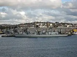 Le HMS Cumberland le long du quai devant le bâtiment Quadrangle (à gauche) et une cale sèche couverte faisant partie du complexe de rééquipement de frégate (à droite)
