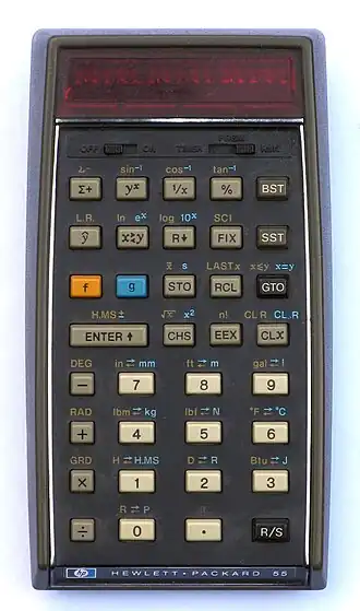 La HP-55 est une calculatrice scientifique de la lignée des 35-45, développée spécialement pour la conversion entre les unités de mesure US (miles, pounds, etc.) et le système métrique international. Peu utilisée en Europe, et chère de surcroît.