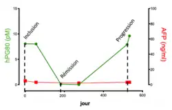 De plus, la détection plus précoce de petites lésions et le suivi de la récidive peuvent être améliorées par la mesure des taux de hPG80, en tant que biomarqueur sanguin complémentaire dans une cohorte de patients atteints de carcinome hépatocellulaire, traités par des traitements locaux ou systémiques (Fig. 3)[1]. L’intérêt de mesurer hPG80 prend son sens chez les patients pour lesquels l’alpha-foetoprotéine (AFP) est en dessous du seuil établi en pratique clinique à 20 ng/ml[46]. Suivant la prise en charge de la maladie, les patients en rémission présentent des taux de hPG80 plus faibles que ceux pour lesquels le cancer est toujours actif.
