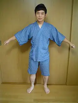 Le Jinbei, ou jinbee, est un vêtement traditionnel japonais porté par les hommes et les garçons en été. Il se compose d'une sorte de veste et d'un pantalon assorti.
