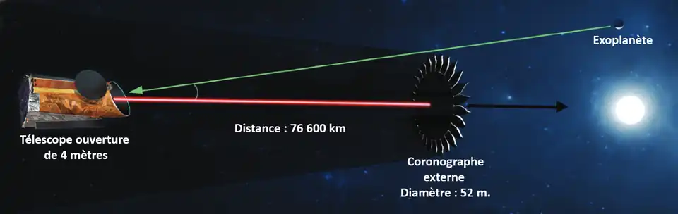 Le coronographe intercepte la lumière de l'étoile ciblée, pour la masquer au télescope et ne pas l'éblouir dans l'observation des astres situés dans l'orbite de l'étoile. La configuration du télescope la plus complète inclut à la fois un coronographe interne traditionnel et un coronographe externe (starshade) placé à plusieurs dizaines de milliers de kilomètres du télescope. Aucun télescope spatial n'a jusqu'à présent mis en œuvre ce dernier dispositif mais il a fait l'objet de nombreuses recherches au sein de la NASA (notamment dans le cadre de la Mission New Worlds) et un projet est en cours au sein de l'agence spatiale pour porter d'ici 2023 le niveau de maturité de cette technologie à 5 (technologie validée dans un environnement significatif)[13]. Les deux configurations offrent des avantages et des inconvénients et chacune est particulièrement bien adaptée pour certains types d'observation[14].