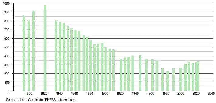 L'évolution du nombre d'habitants est connue à travers les recensements de la population effectués dans la commune depuis 1793. Pour les communes de moins de 10 000 habitants, une enquête de recensement portant sur toute la population est réalisée tous les cinq ans, les populations de référence des années intermédiaires étant quant à elles estimées par interpolation ou extrapolation[31]. Pour la commune, le premier recensement exhaustif entrant dans le cadre du nouveau dispositif a été réalisé en 2005[32].