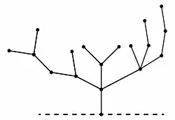 - Hackenbush original : Tous les segments de ligne sont de la même couleur et peuvent être coupés par n'importe quel joueur. Cela signifie que les gains sont symétriques et que chaque joueur effectue les mêmes opérations en fonction de sa position sur le plateau (dans ce cas, en fonction de la structure du dessin).