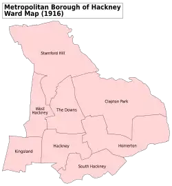 En 1894, le district et le conseil sont dissous, la vestry d'Hackney reprenant ses fonctions au sein de la paroisse. En 1894, en raison de l'augmentation de la population, la paroisse est divisée à nouveau en huit quartiers (élisant des vestrymen)[3],[4] :
