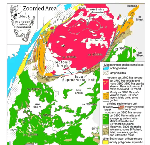 Les témoignages pétrologiques de cette période sont très rares[9]. Durant les dernières décennies du XXe siècle, des géologues ont identifié et daté quelques roches de l'Hadéen sur différents sites (ouest du Groenland, nord-ouest du Canada, ouest de l'Australie). La plus ancienne formation de roche sédimentaire connue est située au sud-ouest du Groenland, dans la ceinture de roches vertes d'Isua. Elle a révélé quelques sédiments altérés datés d'environ −3,8 Ga et provenant d'un dyke qui a pénétré des roches déjà maintes fois déposées.