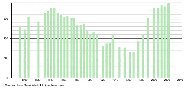 L'évolution du nombre d'habitants est connue à travers les recensements de la population effectués dans la commune depuis 1793. Pour les communes de moins de 10 000 habitants, une enquête de recensement portant sur toute la population est réalisée tous les cinq ans, les populations de référence des années intermédiaires étant quant à elles estimées par interpolation ou extrapolation[23]. Pour la commune, le premier recensement exhaustif entrant dans le cadre du nouveau dispositif a été réalisé en 2006[24].