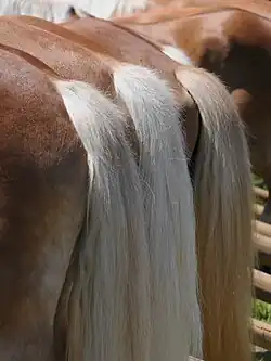 Les crins, crinière et queue, sont longs, abondants et soyeux, les fanons clairs et abondants[52]. La crinière est généralement gardée la plus longue possible, tombant des deux côtés de l'encolure.