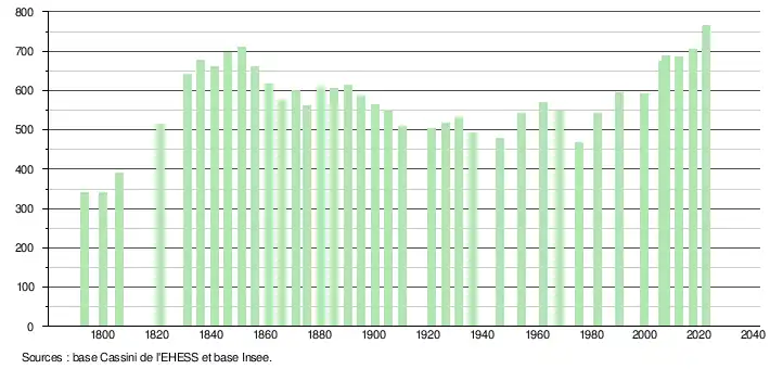 L'évolution du nombre d'habitants est connue à travers les recensements de la population effectués dans la commune depuis 1793. Pour les communes de moins de 10 000 habitants, une enquête de recensement portant sur toute la population est réalisée tous les cinq ans, les populations de référence des années intermédiaires étant quant à elles estimées par interpolation ou extrapolation[26]. Pour la commune, le premier recensement exhaustif entrant dans le cadre du nouveau dispositif a été réalisé en 2007[27].