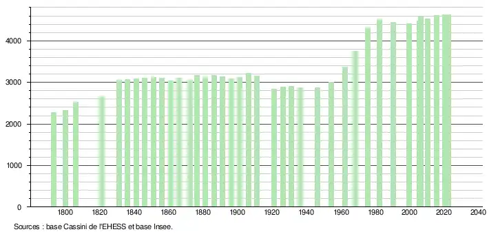| L'évolution du nombre d'habitants est connue à travers les recensements de la population effectués dans la commune depuis 1793. Pour les communes de moins de 10 000 habitants, une enquête de recensement portant sur toute la population est réalisée tous les cinq ans, les populations de référence des années intermédiaires étant quant à elles estimées par interpolation ou extrapolation[32]. Pour la commune, le premier recensement exhaustif entrant dans le cadre du nouveau dispositif a été réalisé en 2005[33]. En 2022, la commune comptait 4 622 habitants[Note 5], en évolution de −0,9 % par rapport à 2016 (Landes : +5,78 %, France hors Mayotte : +2,11 %). |