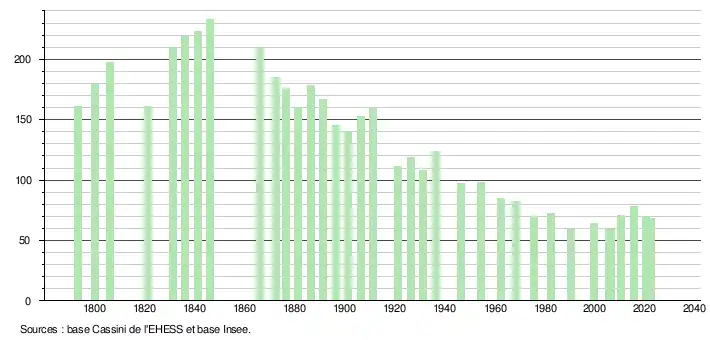 L'évolution du nombre d'habitants est connue à travers les recensements de la population effectués dans la commune depuis 1793. Pour les communes de moins de 10 000 habitants, une enquête de recensement portant sur toute la population est réalisée tous les cinq ans, les populations de référence des années intermédiaires étant quant à elles estimées par interpolation ou extrapolation[15]. Pour la commune, le premier recensement exhaustif entrant dans le cadre du nouveau dispositif a été réalisé en 2005[16].