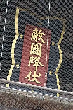 Durant la première invasion mongole le (ère Bun'ei 11, 20e jour du 10e mois), les défenseurs japonais sont repoussés de plusieurs sites de débarquement[3]. Au cours des combats qui s'ensuivent, le Hakozaki-gū est détruit par des incendies[4]. Quand le sanctuaire est reconstruit, une calligraphie Tekikoku kōfuku (敵国降伏) est installée sur la porte de la tour. La calligraphie est écrite de la main de l'empereur Daigo, dédicacée par l'empereur Daijo Kameyama et supplie que soient défaits les envahisseurs.