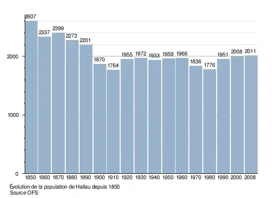 Le graphique suivant résume l'évolution de la population de Hallau entre 1850 et 2008[3] :