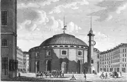 La Halle au Blé, commencée en 1763, fut terminée en 1767, sur les dessins et sous la direction de Nicolas Le Camus de Mézières. C’est un bâtiment de forme circulaire, ayant 68 m. de diamètre hors œuvre. Il est percé de 25 arcades. On monte par deux escaliers d’une construction remarquable, à une galerie où sont déposés les menus grains dans des corridors voûtés et construits en briques. Pour mettre à l’abri les marchandises déposées dans la cour, on résolut de couvrir cette construction d’une coupole.Jacques-Guillaume Legrand et Jacques Molinos s’acquittèrent avec talent de ce travail, qui fut terminé en 1783. Cette coupole, construite en bois, fut incendiée en 1802.