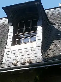 Cet ensemble supporte un étage mansardé divisé en deux dans le sens de la longueur par un large couloir. La partie inférieure de la toiture (brisis) est recouverte d'ardoises, la partie supérieure (terrasson) est couverte en tuiles[5]. Deux lucarnes, aux extrémités du couloir, éclairent le comble dont les dégagements latéraux servaient à stocker les étoffes[1].