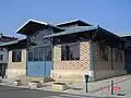 Les murs sont constitués jusqu'aux fermes de la charpente d'un appareillage en briques à trois tons et décor losangé et continués par-delà par des plaques en verre armé.