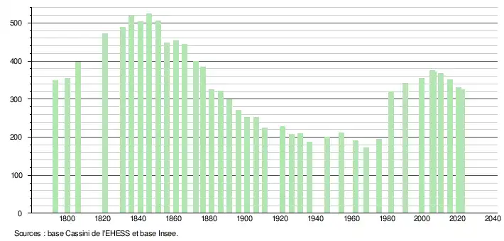 L'évolution du nombre d'habitants est connue à travers les recensements de la population effectués dans la commune depuis 1793. Pour les communes de moins de 10 000 habitants, une enquête de recensement portant sur toute la population est réalisée tous les cinq ans, les populations de référence des années intermédiaires étant quant à elles estimées par interpolation ou extrapolation[30]. Pour la commune, le premier recensement exhaustif entrant dans le cadre du nouveau dispositif a été réalisé en 2005[31].
