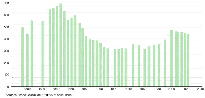 L'évolution du nombre d'habitants est connue à travers les recensements de la population effectués dans la commune depuis 1793. Pour les communes de moins de 10 000 habitants, une enquête de recensement portant sur toute la population est réalisée tous les cinq ans, les populations de référence des années intermédiaires étant quant à elles estimées par interpolation ou extrapolation[25]. Pour la commune, le premier recensement exhaustif entrant dans le cadre du nouveau dispositif a été réalisé en 2008[26].