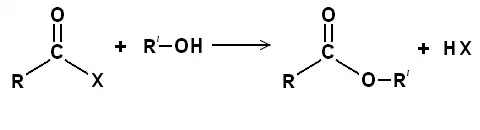 Les halogénures d'acyle, parfois nommés halogénures d'acides, sont des dérivés halogénés des acides carboxyliques, de formule générale R—C(=O)X. Ils sont intéressants au niveau réactionnel car en plus d'être très réactifs, lorsqu'ils réagissent, ils ne forment pas d'eau mais l'acide halogénohydrique qui peut entrer en réaction avec le milieu. Cet acide formé peut être piégé par addition d'une base dans le milieu, typiquement la pyridine.