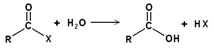 Les halogénures d'acyle sont très réactifs, en particulier les chlorures. Il faut donc pour cela éviter de les mettre dans un milieu aqueux car sinon ils dégagent l'acide halohydrique et reforment l'acide carboxylique correspondants: RCOCl + H2O → RCOOH + HCl