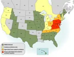 - ↑ (en) Jacobs, S.B., et K. Bernhard. 2009. Entomological Notes on the Brown Marmorated Stink Bug. College of Agricultural Sciences, US Department of Agriculture. Page consultée le 15 novembre 2017.
