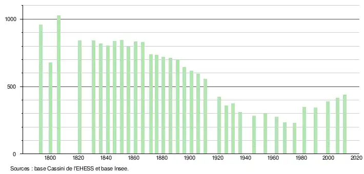 - ↑ Dans le tableau des recensements et le graphique, par convention dans Wikipédia, le principe a été retenu, pour les populations légales postérieures à 1999 de n’afficher dans le tableau des recensements et le graphique que les populations correspondant à l'année 2006, première population légale publiée calculée conformément aux concepts définis dans le décret no 2003-485 du 5 juin 2003, et les années correspondant à une enquête exhaustive de recensement pour les communes de moins de 10 000 habitants, ainsi que la dernière population légale publiée par l’Insee.