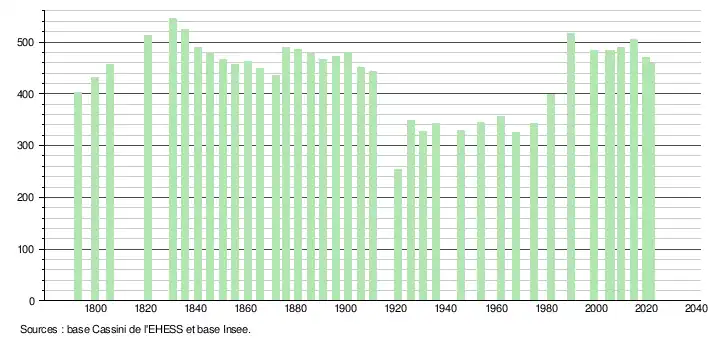 L'évolution du nombre d'habitants est connue à travers les recensements de la population effectués dans la commune depuis 1793. Pour les communes de moins de 10 000 habitants, une enquête de recensement portant sur toute la population est réalisée tous les cinq ans, les populations de référence des années intermédiaires étant quant à elles estimées par interpolation ou extrapolation[36]. Pour la commune, le premier recensement exhaustif entrant dans le cadre du nouveau dispositif a été réalisé en 2005[37].