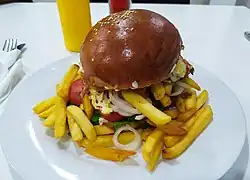 Un hamburger, ou par aphérèse burger, est un sandwich d'origine allemande, composé de deux pains de forme ronde[1] (bun) généralement garnis d'une galette de steak haché (généralement du bœuf) et de crudités, salade, tomate, oignon, cornichon (pickles) ainsi que de sauce.