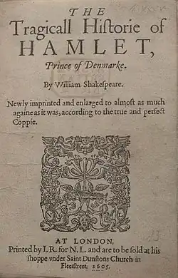 La première version publiée d'Hamlet (appelée le « Premier Hamlet » par François-Victor Hugo[10]) comporte un peu plus de la moitié de celle du deuxième texte. Elle fut publiée par les libraires Nicholas Ling et John Trundell en 1603 et découverte en 1823 par John Burbury.
