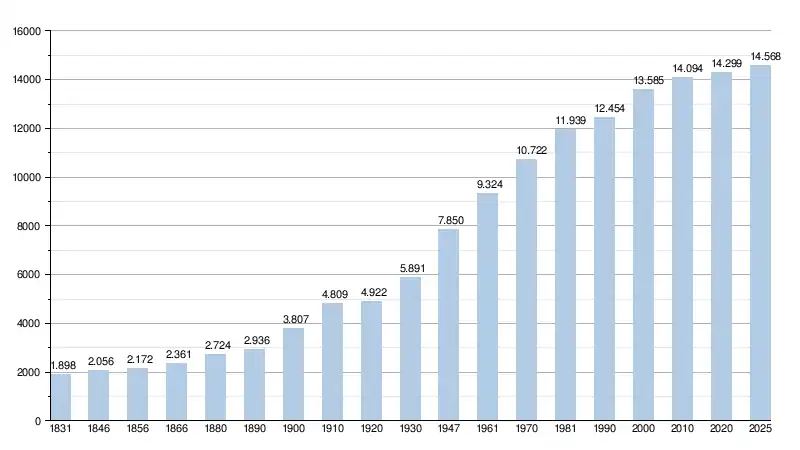 Le graphique suivant décrit l'évolution de la population de la ville. Les données ci-après intègrent les anciennes communes dans les données avant la fusion en 1977.