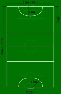 - La ligne de penalty (modification) : devant le milieu de chaque but, à 14 mètres de la ligne de but, se trouve la marque de jet de 14 mètres (trait de 1 mètre de long).