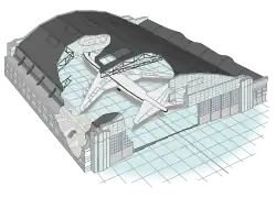 Hangar No. 2 de l'aéroport naval de l'US Marine Corps, mesurant 330 × 90 × 60 mètres- Un Airbus A319 en réparation dans un hangar de maintenance