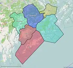 Depuis 2016, la commune est divisée en districts, qui correspondent aux anciennes paroisses – Dalarö, Muskö, Ornö, Utö, Västerhaninge et Österhaninge.