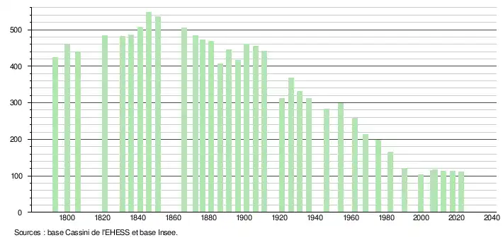 L'évolution du nombre d'habitants est connue à travers les recensements de la population effectués dans la commune depuis 1793. Pour les communes de moins de 10 000 habitants, une enquête de recensement portant sur toute la population est réalisée tous les cinq ans, les populations de référence des années intermédiaires étant quant à elles estimées par interpolation ou extrapolation[17]. Pour la commune, le premier recensement exhaustif entrant dans le cadre du nouveau dispositif a été réalisé en 2007[18].