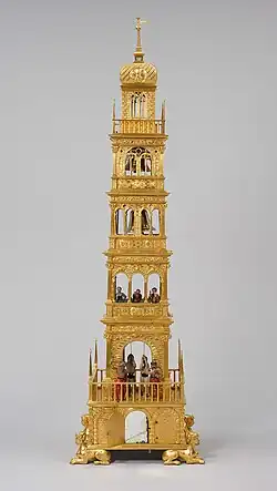 - Une tour-horloge (« Glockenturmautomat »), vers 1580, de dimensions imposantes 110,8 × 24,7 × 20,5 cm, en bronze doré, les figurines en bois[12].