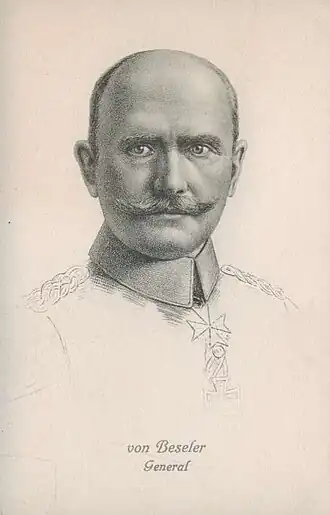 Après le déclenchement de la Première Guerre mondiale, Beseler, comme Paul von Hindenburg, reprend du service actif et il est nommé commandant du 3e corps de réserve (de) qui obtient des succès sur le front de l'ouest, notamment la prise d'Anvers en 1914, et, plus tard, sur le front de l'est, la prise de la forteresse de Novogeorgievsk (Modlin), en Pologne, le .